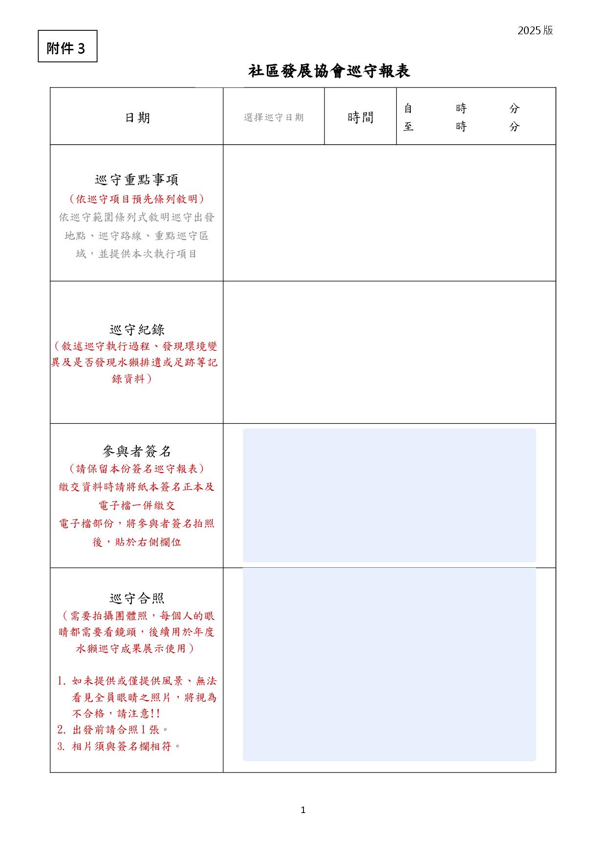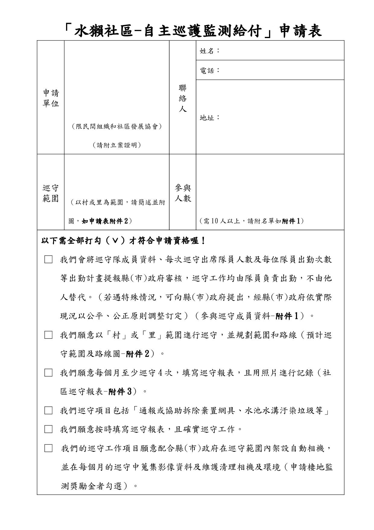 需提送公文並檢附以下資料:(有更新版本,請下載>>115年度金門水獺生態給付申請書-社區)
