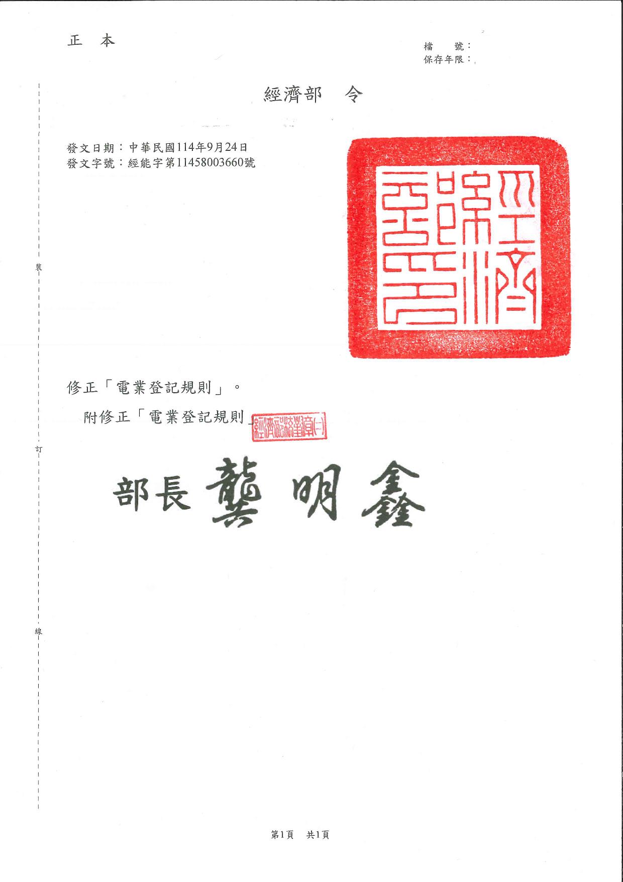 經濟部於中華民國114年9月24日以 經能字第11458003660號令修正發布「電業登記規則」含發布令影本