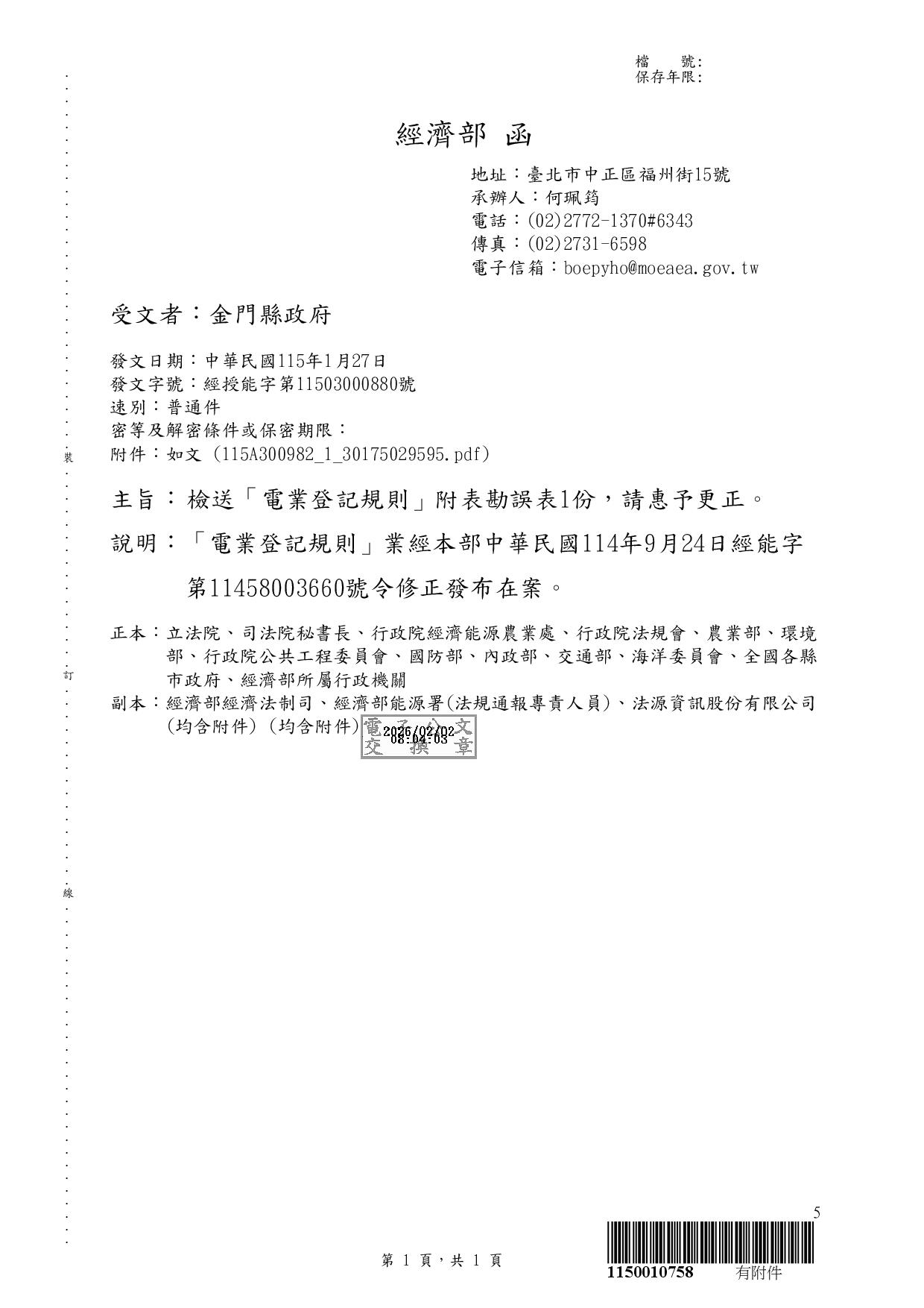 經濟部修正發布「電業登記規則」附表勘誤表1份